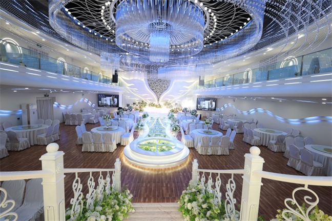 喜事匯酒店,五號宴會廳-水晶廳以"星辰夢境"為設計靈感,將現(xiàn)代藝術與自然美學結合。全廳采用無柱式設計,通透空間可容納29桌賓客。頂部懸掛璀璨燈飾,光影流轉間如銀河傾瀉,搭配流線型裝飾墻,營造出360°沉浸式光影體驗,讓每個瞬間都閃耀非凡。該宴會廳自帶高雅精致的場景布置,從燈光到裝飾皆經(jīng)過設計,無需額外聘請婚慶公司進行場布,即可呈現(xiàn)如夢似幻的浪漫氛圍,讓新人省心省力,享受美麗婚禮。